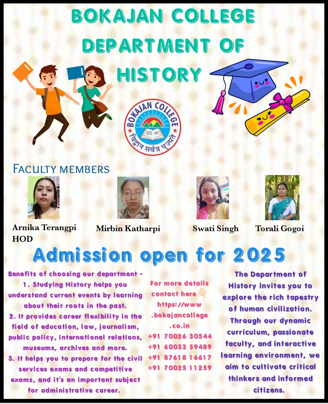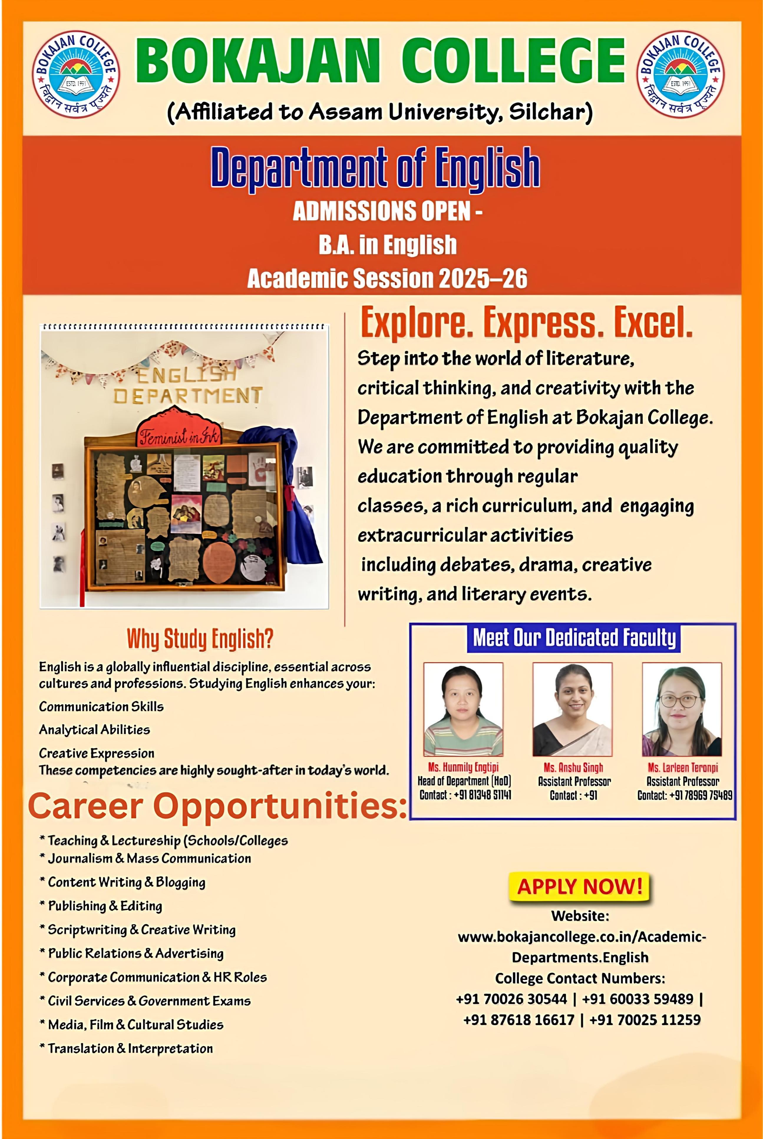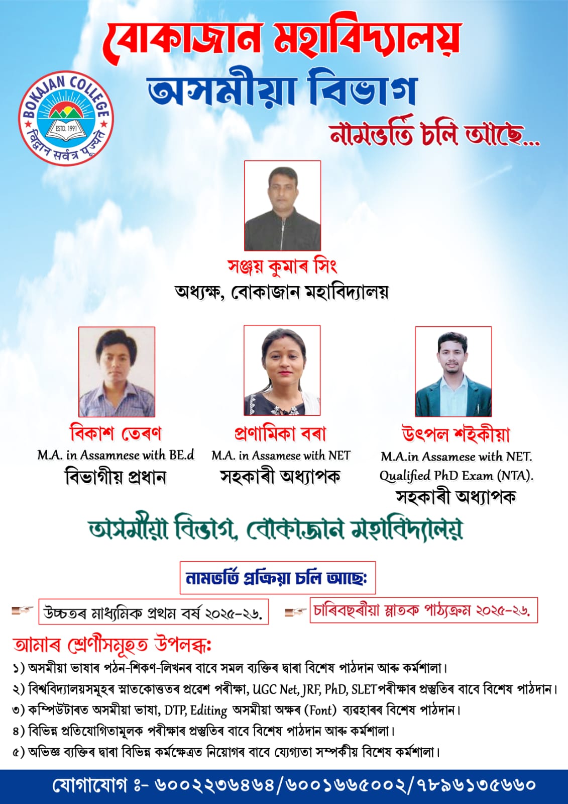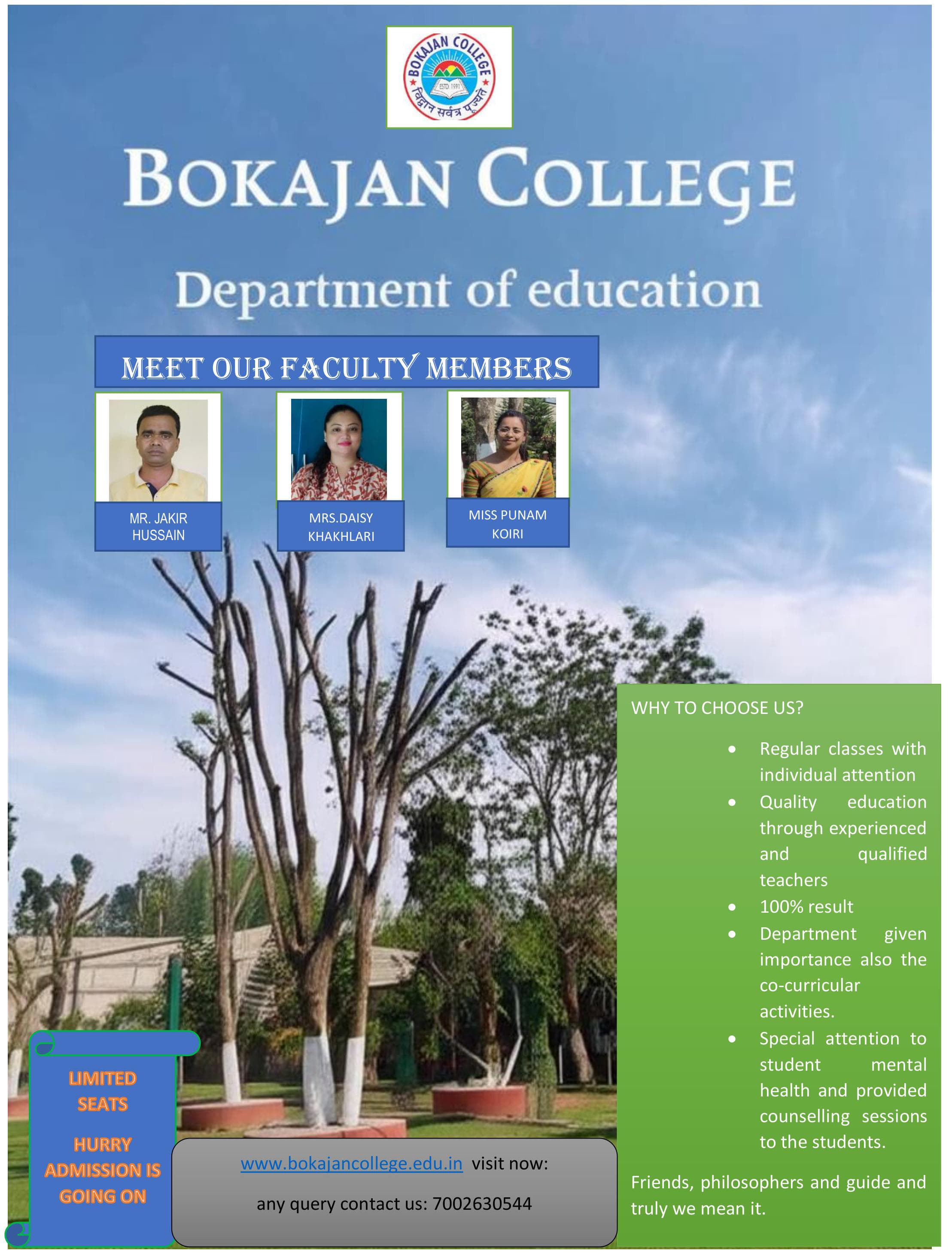 Since 1991, Bokajan College has expanded both in size and reputation. There are 09 Departments in the college offering B.A. (pass), B.A. (Hons), B.Com. (pass), B.Com (Hons), H.S (Arts) & H.S. (Commerce) to equip students with knowledge, skill, experience and confidence, the benefits of which they can reap well into the future. Despite the fact that the college is still fed by students of average merit it has to its cre  ... Read More